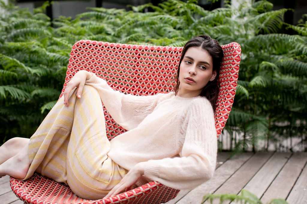 To ensure the versatility and creativity of our collection, we’re now also featuring items that are machine-knitted alongside our hand-knitted pieces. Why? Not because machine work is faster or easier. But because knitting new pieces on a machine allows us to create new unique styles on top of our handmade ones. Some designs just demand a more refined or firm technique, something that’s not always possible by hand.